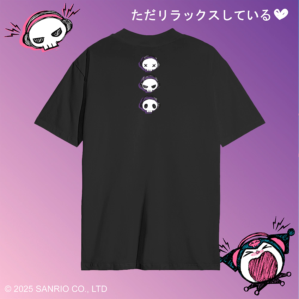 Com base chumbo e um design ousado licenciado Sanrio, essa camiseta traz a Kuromi em estilo rabisco, acompanhada por caveirinhas ouvindo música e a frase "PLAY IT LOUDER!".